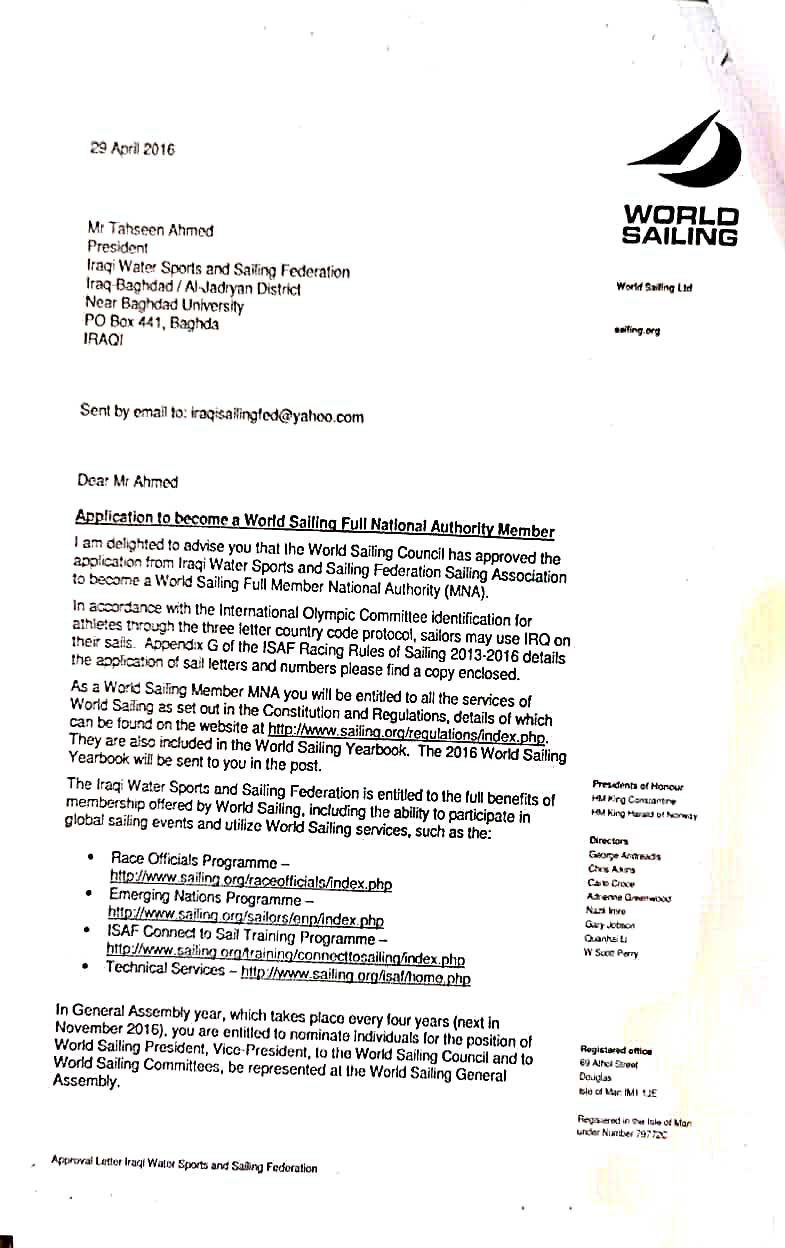وعلى امتداد عشرات الامتار من ضفاف نهر دجلة الخالد تمتد اجنحة الاتحاد العراقي للشراع والالعاب المائية . وتبذل جهودا غير عادية وعمل يستمر ليل نهار من اجل ان يصل الاتحاد الى المكانة التي نفتخر بها لكوننا قطعنا اشواطا كبيرة امتدت لسنوات عدة لتحقيق ما كنا نتطلع اليه .